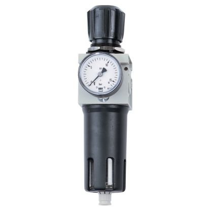 Nastavovací knoflík s aretací. Regulační rozsah 0-12 bar. Sériově dodávané s manometrem a filtr. článkem 20 µm.