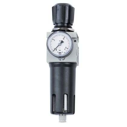 Nastavovací knoflík s aretací. Regulační rozsah 0-12 bar. Sériově dodávané s manometrem a filtr. článkem 20 µm.