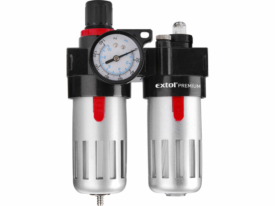 Regulátor tlaku s filtrem, manometrem a mlhovým přimazávačem oleje je určen k úpravě stlačeného vzduchu pro pohon pneumatického nářadí. Zařízení umožňuje regulovat tlak vzduchu, odstranit zkondenzovanou vlhkost ze vzduchu a přidávat pneumatický olej do proudu stlačeného vzduchu ve formě mlhy.