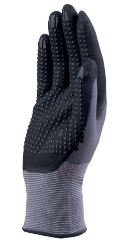 Potažená pletená rukavice, mechanická, úpletová, materiál a povrchová úprava impregnace : Hladký aqua-polymer, materiál teček (povrchová úprava dlaně) : Nitrilové tečky, podpůrné materiály útkové vlákno.