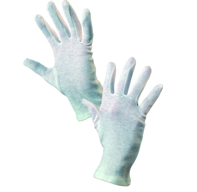 Textilní šitá rukavice z běleného bavlněného úpletu, střih fourchette. Použití: pro práci vyžadující ochranu produktu před znečištěním, manipulace s lehkým a drobným materiálem, jemná montáž