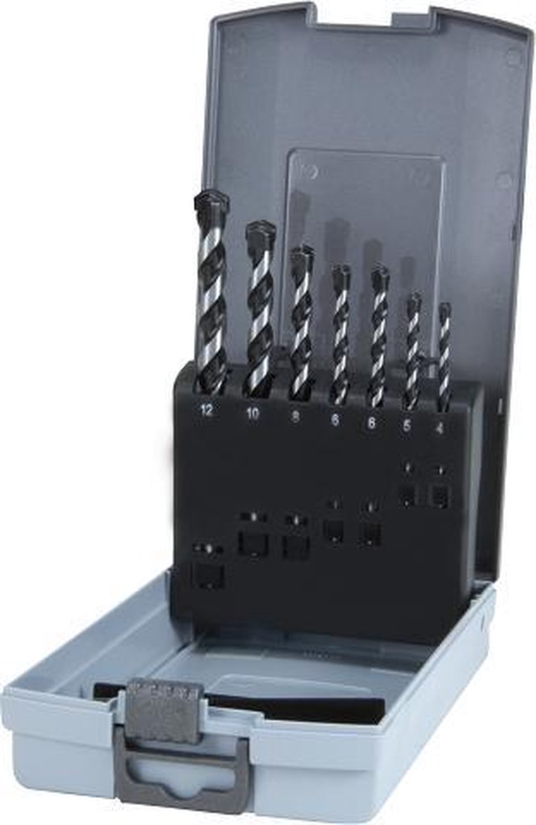 Sada obsahuje vrtáky o průměru: 4x75 mm, 5x85 mm, 6x100 mm, 6x100 mm, 8x120 mm,10x120 mm,12x150 mm