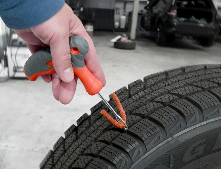 Na místě, kde je pneumatika propíchnutá a odstraňte předmět, který způsobil porušení, do otvoru zasuňte průtažník (šídlo / vrták), a následně ho protahujte směrem nahoru a dolu - do doby než bude snadno procházet otvorem - tímto je otvor vyčištěn a připraven, knot vybalený z ochranné fólie provlékněte otvorem vidlice a naneste na něj vulkanizační roztok, zastrčte vidlici s nasazeným knotem do otvoru tak, aby jeho polovina zůstala z vnější strany pneu, poté otočte vidlicí o 1/4 a pomalu ji vytáhněte, odřízněte zbytek knotu co nejblíže k pneumatice.