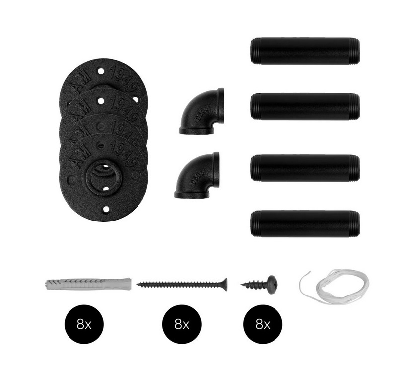 Všechny komponenty potřebné k sestavení naleznete uvnitř speciálního ECO balení! K dispozici příslušenství pro kompletní montáž do zdi. Součástí balení není dřevěná police, kterou volíte dle vlastního vkusu.