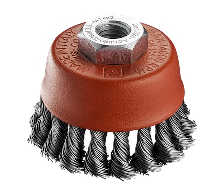 Drátěný hrncový kartáč do úhlové brusky copánkový. Méně agresivní kartáč bez prstence.