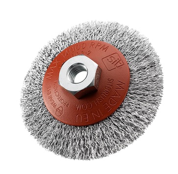 Drátěný kónický kartáč do úhlové brusky kadeřavý. Díky kónickému tvaru jsou tyto kartáče vhodné k opracování nerovných povrchů s hranami, profily a štěrbinami. Vysoce odolné kadeřavé ocelové vlákno.