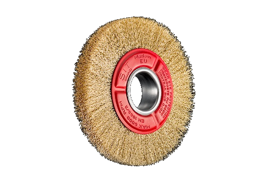 Obvodový kartáč kadeřavý do stolní kotoučové brusky. Lehčí kartáč s menší hustotou drátu.