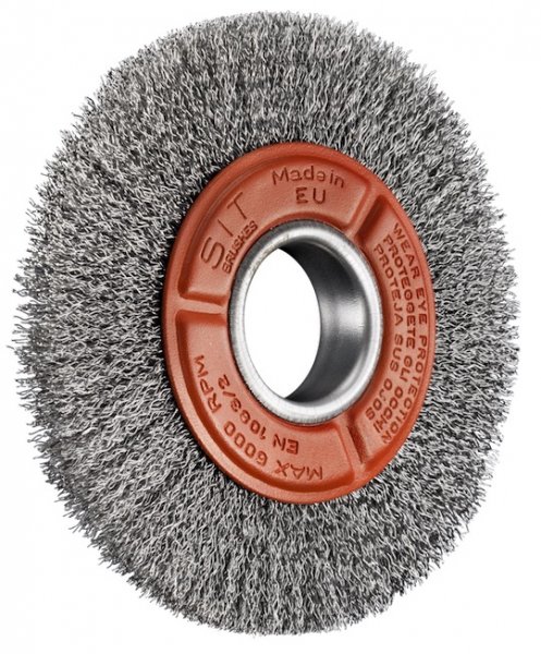 Obvodový kartáč kadeřavý do stolní kotoučové brusky. Vysoce odolná ocel, velmi vysoká hustota vlákna.