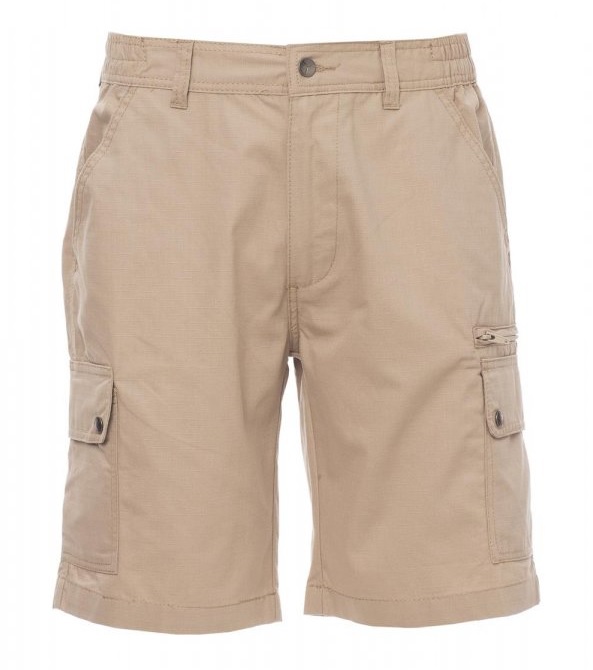 Pánské bermudy, elastické pásky na bocích a poutka v pase, zapínání na zip a na kovový knoflík, dvě přední kapsy klasického střihu, dvě postranní kapsy s klopou a druky, jedna kapsa na zip po levé straně, skrytá kapsa na svinovací metr po pravé straně, dvě zadní prostřižené kapsy s knoflíkovou dírkou a knoflíkem.