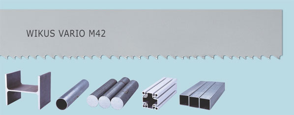 WIKUS VARIO® M42. Špičky zubů zhotovené ze zvláště odolné oceli HSS-M 42 společně s variabilním ozubením vytváří nástroj mimořádně vhodný pro sériové řezání vibrujících a neklidných řezů. Nosný materiál pásů je vyroben ze speciální oceli vyráběné pro Wikus s vysokým obsahem legujících prvků a 4% chromu. Tento materiál zajišťuje vysokou dynamickou pevnost a odolnost proti opotřebení.