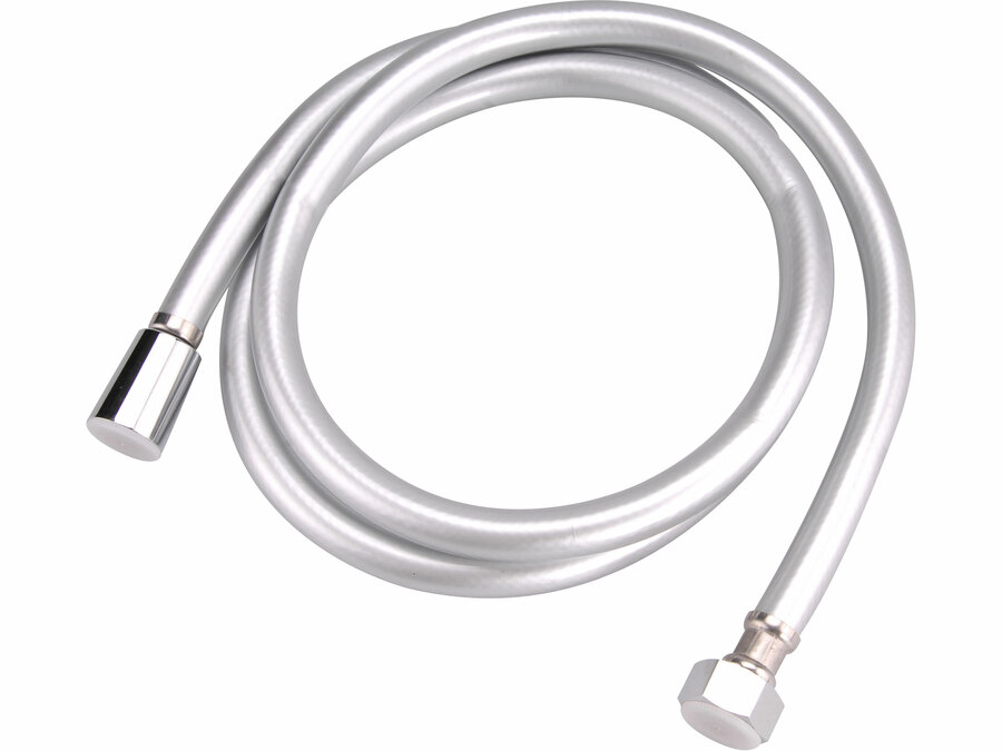 Hadice sprchová, stříbrná, 150 cm, PVC. Mosazný otočný konec hadice zabrání zamotání.
