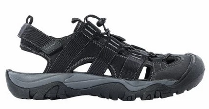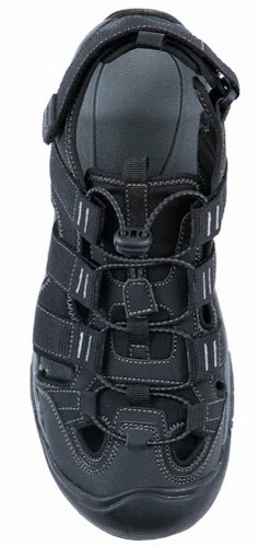Trekový sandál s plnou špicí a textilním svrškem, možnost utažení na patě pomocí pásku, obuv je opatřena šňůrkou pro nastavení šířky a poutkem pro snadnější obouvání.