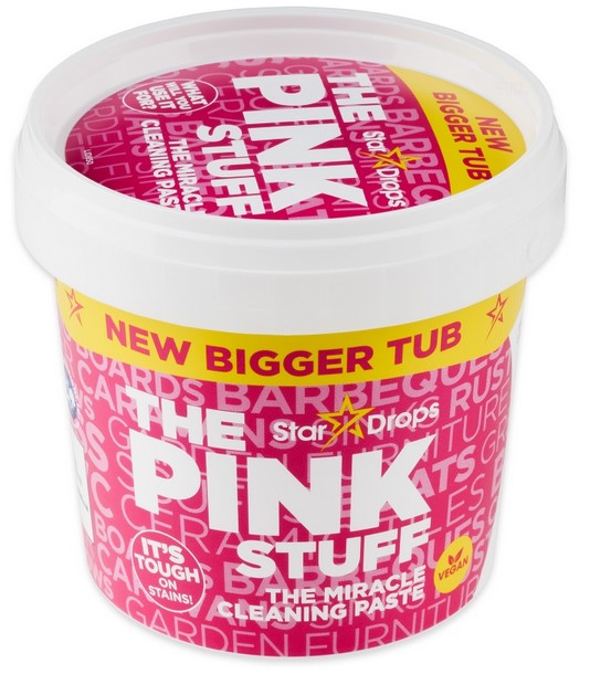 Růžová čisticí pasta STARDROPS Pink Stuff je nazývaná „zázračná čistící pasta“. Jedná se o univerzální čisticí pastu na bázi přírodních ingrediencí, vysoce účinná a lehce abrazivní, pro všestranné použití v celé domácnosti i venku. Čisticí pastu využijete na obuv, nádobí, sporáky, dřezy, grily, sklo, dlaždice a obklady, sprchy, zahradní nábytek, kov, rez atd. Balení má 850 g.
