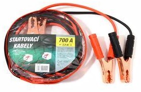 Startovací kabely, barevně označené, se svorkami na akumulátor, praktický obal na kabely uzavíratelný na zip. Materiál CCA, max. proud 700 A, délka 2,5 m.