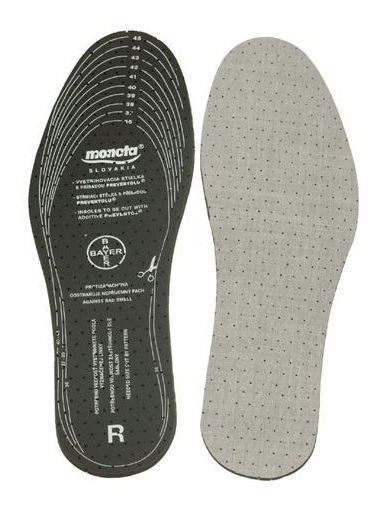 Vložky do obuvi CARBON, s aktivním uhlím a upravitelnou velikostí. Vystřihovací stélka zhotovená z bílé tkaniny a latexové pěny. Má vynikající deodorační vlastnosti, obsahuje aktivní uhlí působící proti zápachu. Stélka může být přizpůsobena do požadované velikosti zastřižením dle předznačené linky,