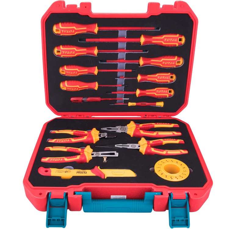 Sada 16ks elektrikářského nářadí je vložena do červeného kufru z tvrzeného PVC.