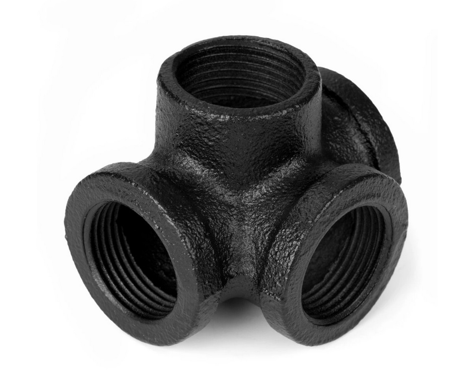 Černá spojka RT-8 ve tvaru TY pro trubkový regálový systém Rusticline. Slouží ke spojení čtyř komponentů se závity (trubek, šroubení, koncovek ad.). Plní funkci rozvětveného kolene.