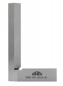 Úhelník nožový (vlasový) KINEX E. Přesný, kalený, rozměr 100x63 mm. Síla 14,5x10,5 mm. Třída přesnosti 00, 55 HRC. Norma: ČSN 25 5103.