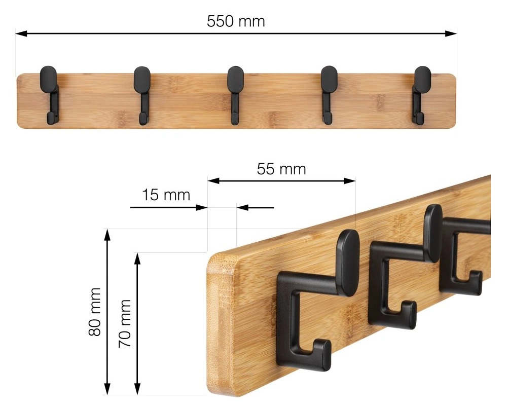 Z bambusového dřeva s pěti háčky v matné černé barvě.