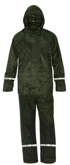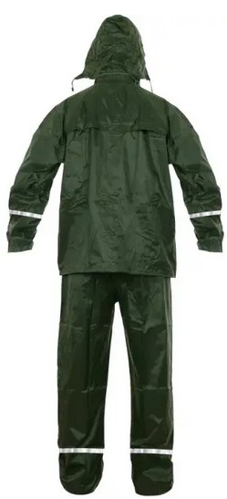 Nepromokavý oděv do deště s kapucí v límci. Zapínání na zip, stahování v dolním okraji, větrání na zádech a v podpaží, kalhoty v pase do gumy, lepené švy, reflexní doplňky. Praktické balení na zip.