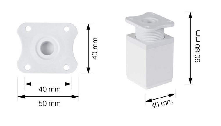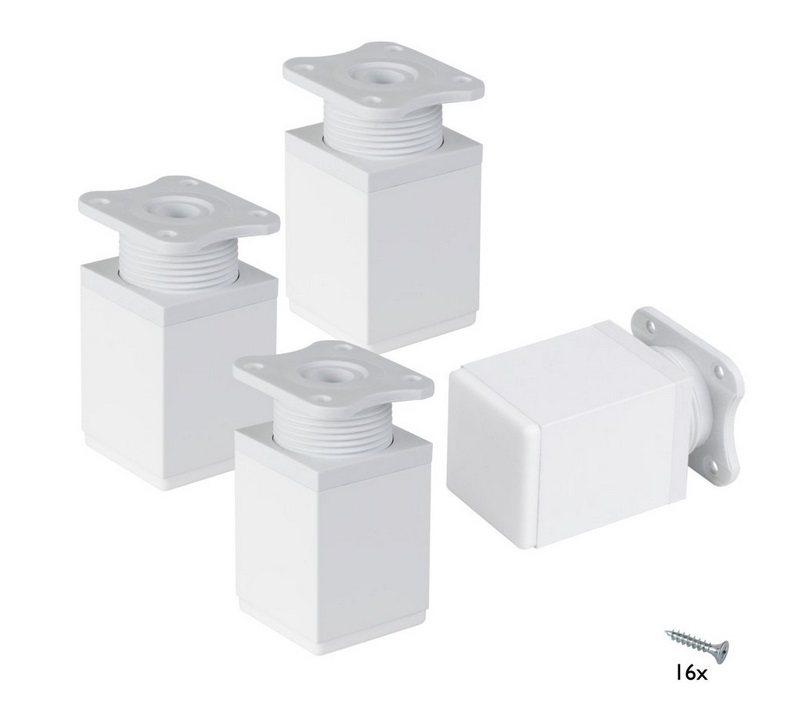 Hranaté plastové nábytkové nohy v bílém provedení v profilu 40x40 mm s nastavitelnou výškou 60-80 mm (pro lepší stabilitu doporučujeme vyšroubovat do 75 mm) a spodním plastovým kluzákem. Součástí balení 4 ks nohou a 16 ks montážních šroubků.