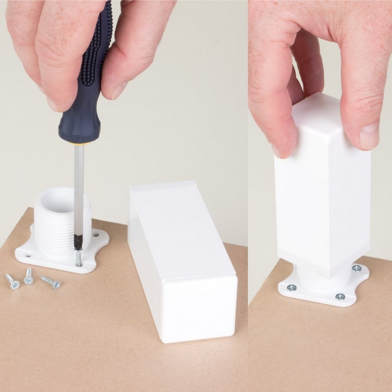 Hranatá plastová nábytková noha v bílém provedení s nastavitelnou výškou je ideální na vyrovnání či přizpůsobení se nerovným povrchům/podlahám.