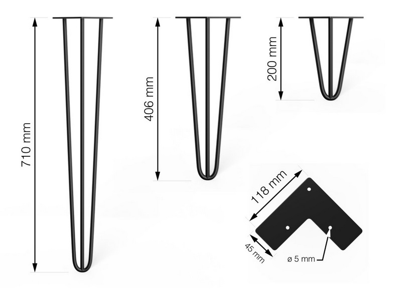 Nábytkové nohy o výšce 200 mm jsou ve své kategorii nejnižší. Střední variantu představují Harpin nohy o výšce 406 mm, které jsou ideální pro montáž k vyšším nočním stolkům nebo konferenčním stolům. K jídelním nebo pracovním stolům jsou pak vhodné Hairpin nohy 710 mm.
