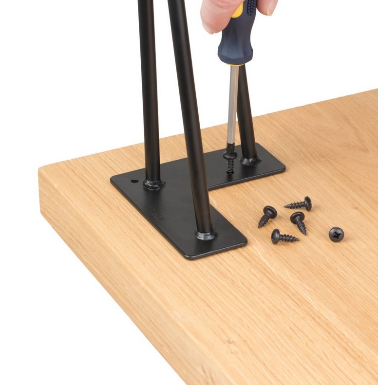 Montáž ocelových Hairpin noh je snadná a rychlá. Součástí každé nohy je totiž montážní deska s 3 předvrtanými otvory, přes které je k nábytku jednoduše připevníte pomocí vrutů (nejsou součástí balení). Na desku jen vyznačte polohy děr, vyvrtejte otvory, aby materiál neprasknul, a nohy přišroubujte. Za pár minut máte hotovo!