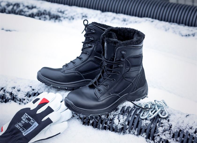 Pracovní kožená poloholeňová zimní obuv, bez kovových součástí, hydrofóbní úprava svršku, zateplení umělým kožíškem.