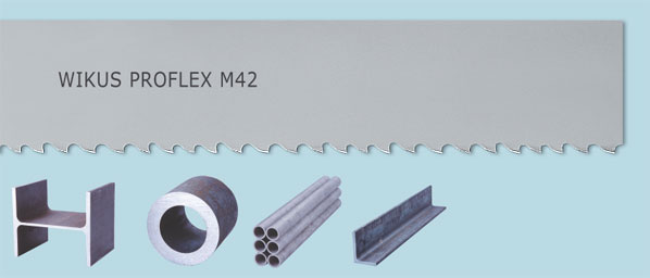 WIKUS PROFLEX M42. Profilový pilový pás, s nově vyvinutou geometrií zubů je určen především pro profily, trubky a svazkové řezání. Zvláštností je rozvod zubů, který výrazně redukuje citlivost břitu zubů na nárazy a eliminuje tak jejich vylamování. Kombinace variabilního dělení zubů s křižným uspořádáním velmi snižuje vibraci pilového pásu a nebezpečí sevření nástroje v důsledku vnitřního napětí děleného materiálu.