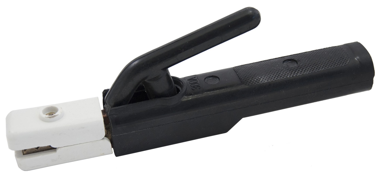 Držák elektrod v profesionálním provedení s izolovanou rukojetí, předlisovanými úchyty pro různé polohy elektrod při sváření a robustní svěrací pružinou.