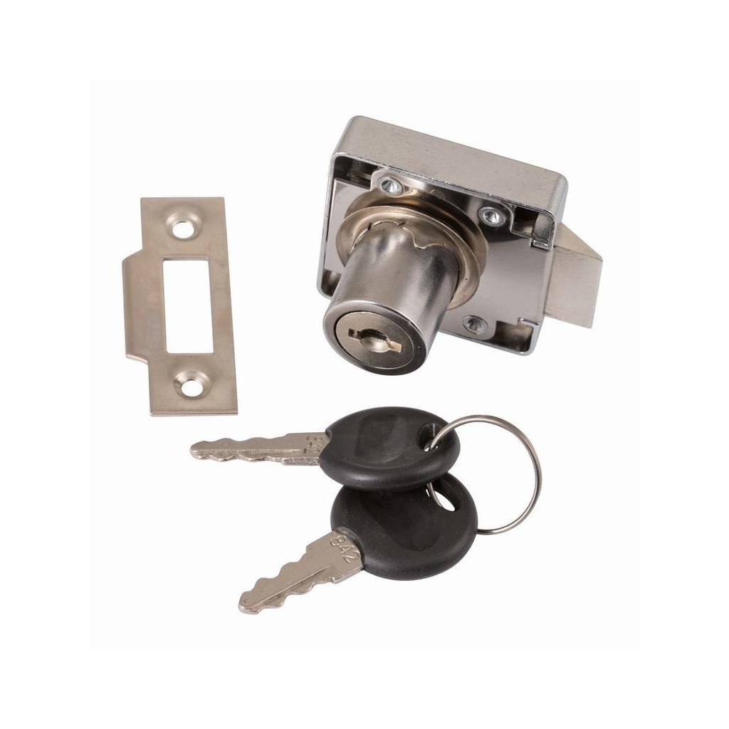 Cylindrický nábytkový zámek o šířce 38 mm a výšce 40 mm sloužící k uzamykání jednotlivých zásuvek, skříněk nebo vitrín.
