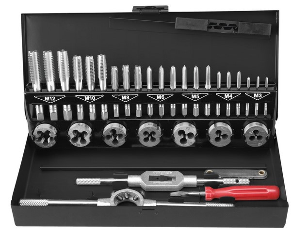 Tříčlenná sada závitníků se závitovými očky z nástrojové oceli se základním stoupáním v kovové kazetě, sada je včetně závitové měrky a šroubováku.