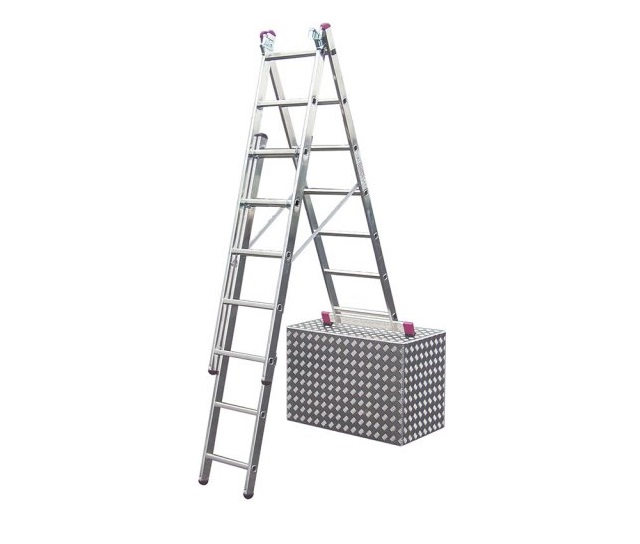 Jeden žebřík, až pět použití: jednoduchý dvoják, schodišťový, dvoják zvýšený a jednoduchý složený ze tří částí pro maximální výšku.